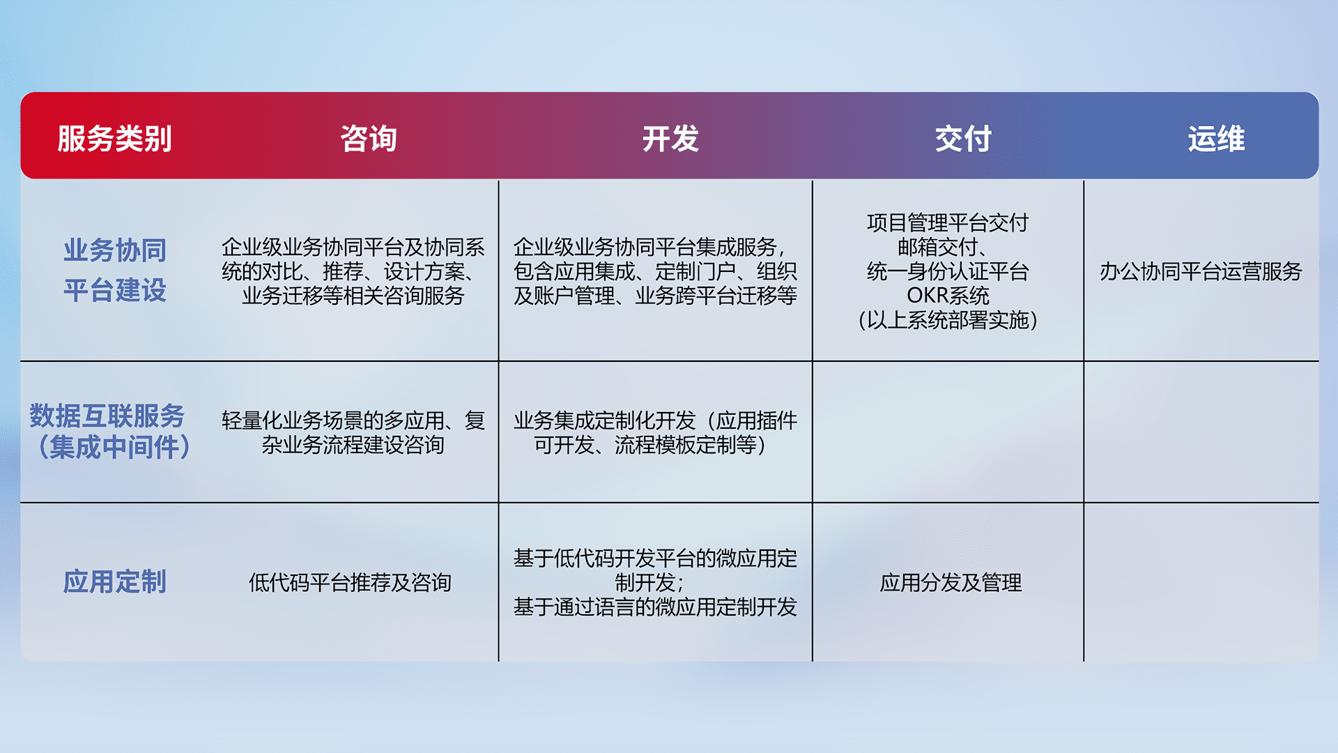 针对钉钉、、、、企微、、IDaas等平台级产品提供产品的规划、、、、方案、、交付、、、、定制化开发等服务,,,实现如统一协同办公、、、智能客户服务、、、混合会议管理、、智能数据查询、、等业务场景,,实现数字化转型。。。